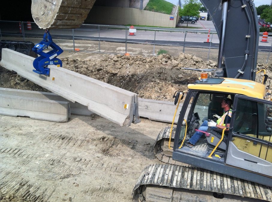 Kenco manufactures the Barrier Lift, a device that moves concrete barrier wall safely, making the job of placing concrete wall much easier. Kenco has everything from the 1500 pound capacity Curb lifterΒ with a 3 – 12 inch grip range,Β to a 40000 pound capacity model that boasts a six to twelve inch grip range. There are also models for the low profile wall found in Florida and Texas. See these and many more Kenco attachments for excavator, wheel loader, and backhoe machines at www.kenco.com .